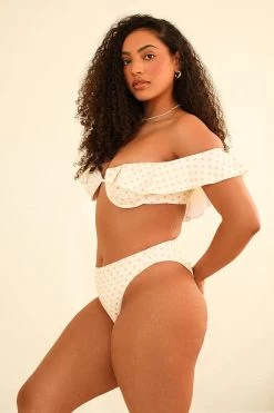 An off-the-shoulder crop bikini top with supportive underwire and playful ruffle overlay. Kate is best paired with our Poppi Bottom.