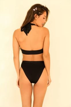 The Penelope Top is the chicest halter top with a thick band around and twisted ties to wrap around the neck. Super cute for a little more coverage, but not too modest with the middle cut-out.